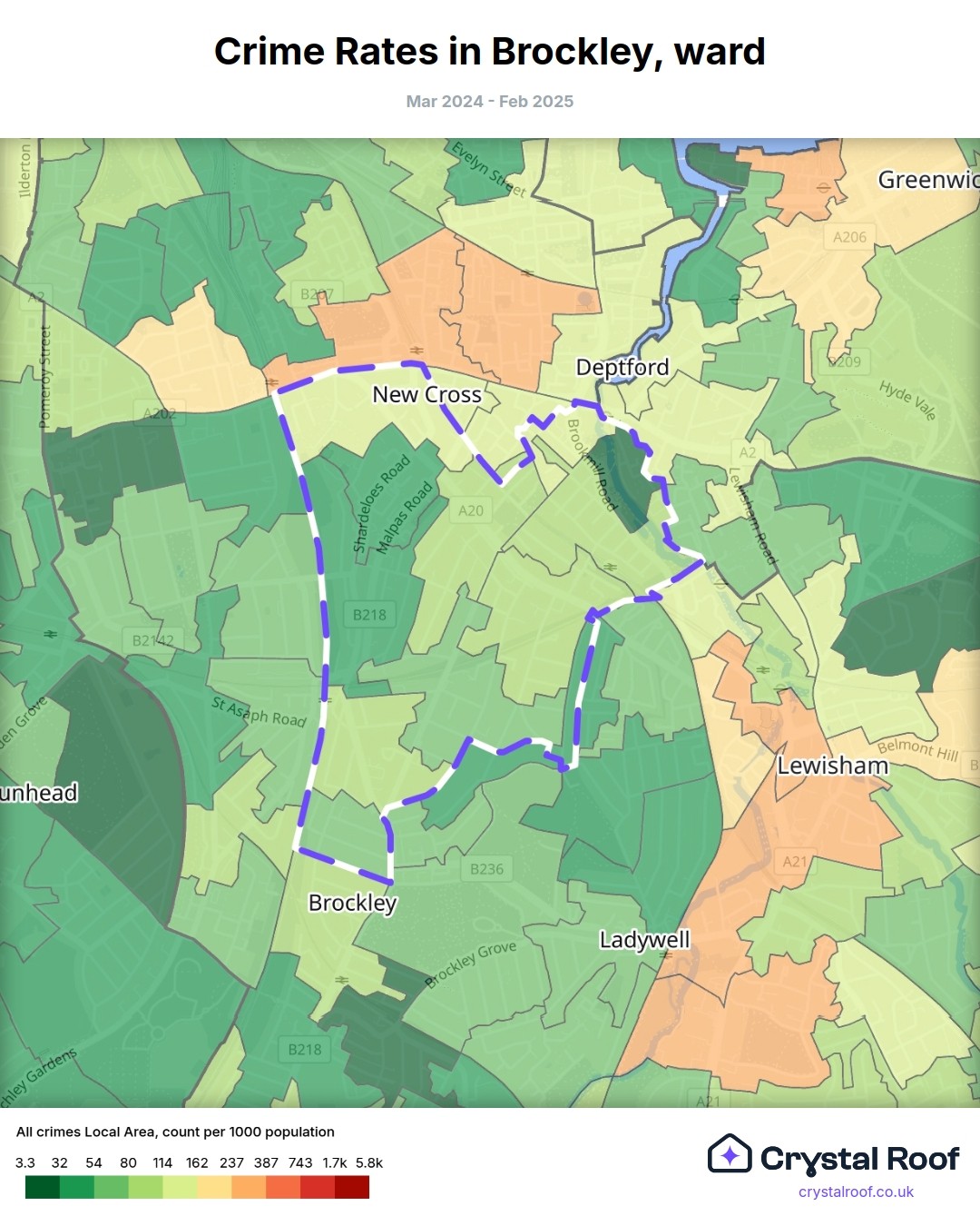 Brockley, (ward) includes areas with the following crime ratings (see map):