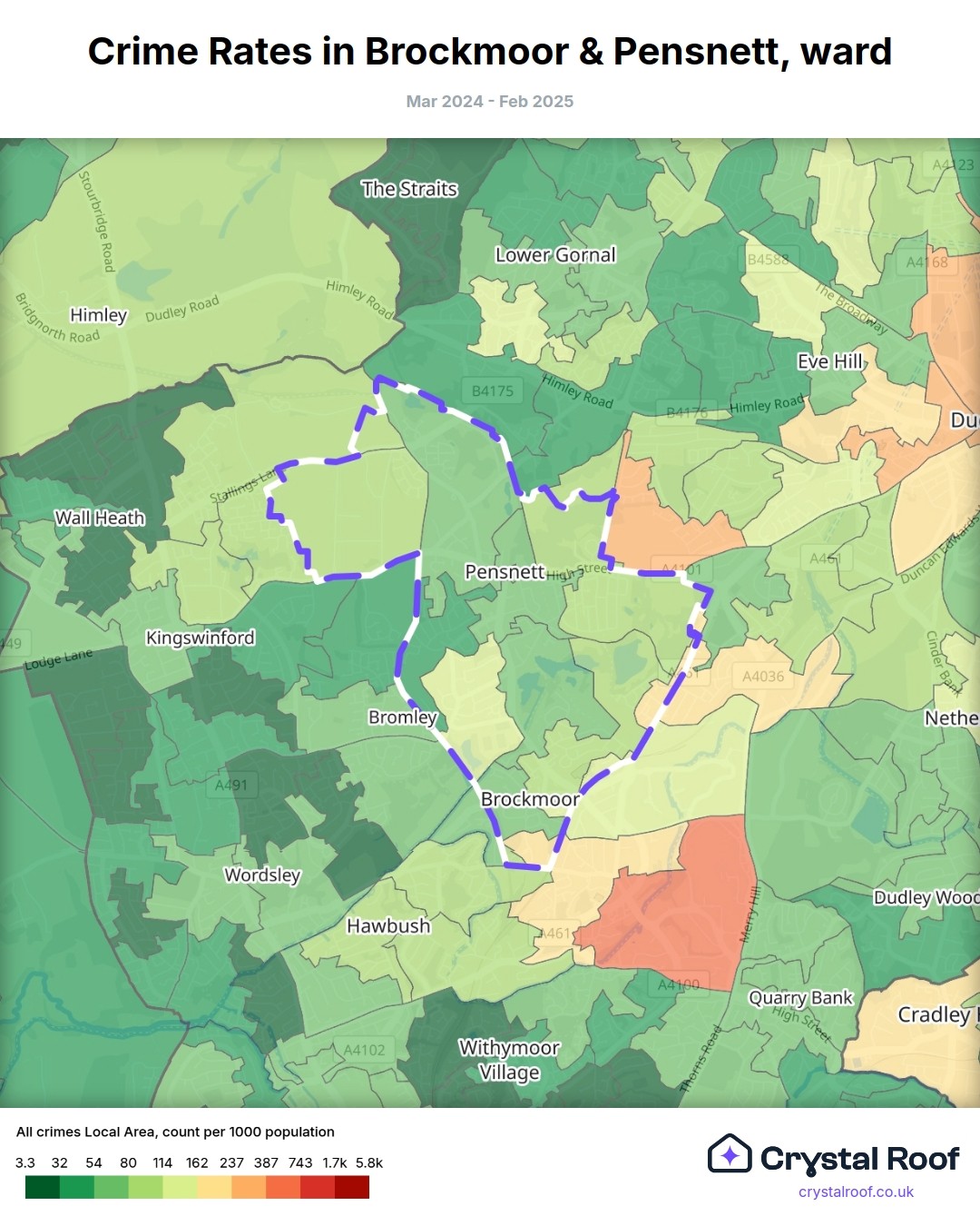 The figures in grey indicate the relative ratings of Brockmoor & Pensnett (ward) for a specific crime type compared to other wards in England and Wales.