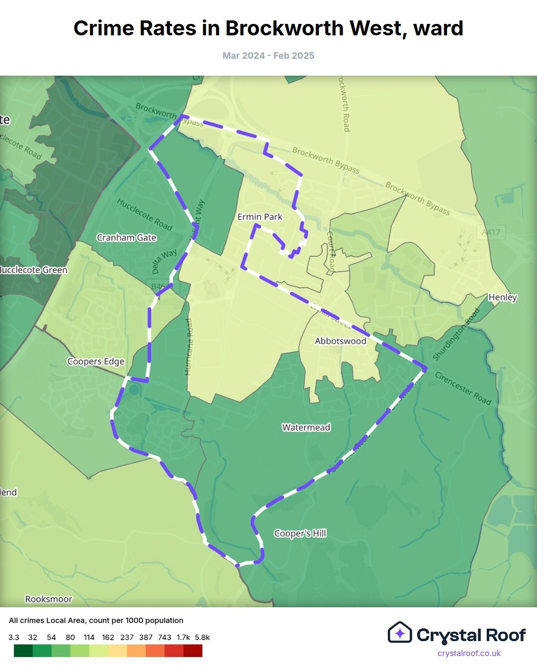 Brockworth West, (ward) includes areas with the following crime ratings (see map):