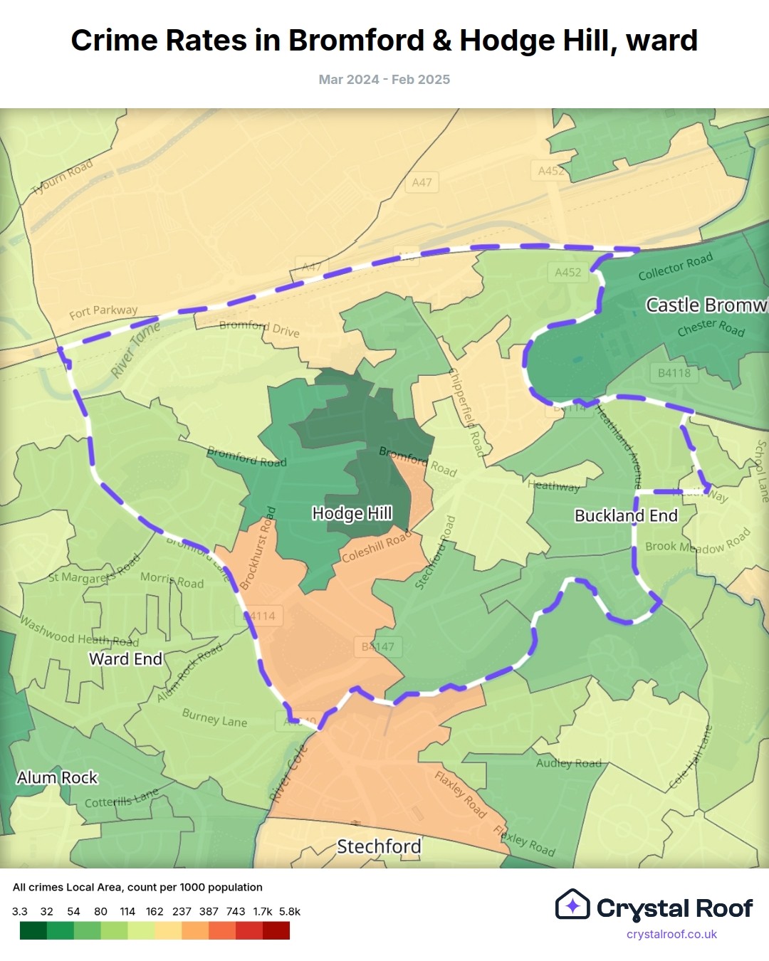 Bromford & Hodge Hill, (ward) includes areas with the following crime ratings (see map):