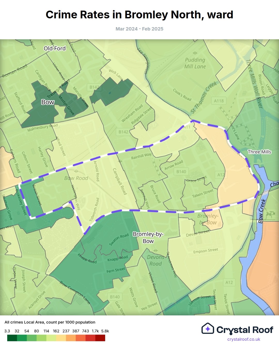 Bromley North (ward) is located within Tower Hamlets (borough). Annual total crime rate in Tower Hamlets (borough) is 153 crimes per thousand resident population, which can be rated as 7 out of 10 or high crime level compared to other local authority districts in England and Wales.