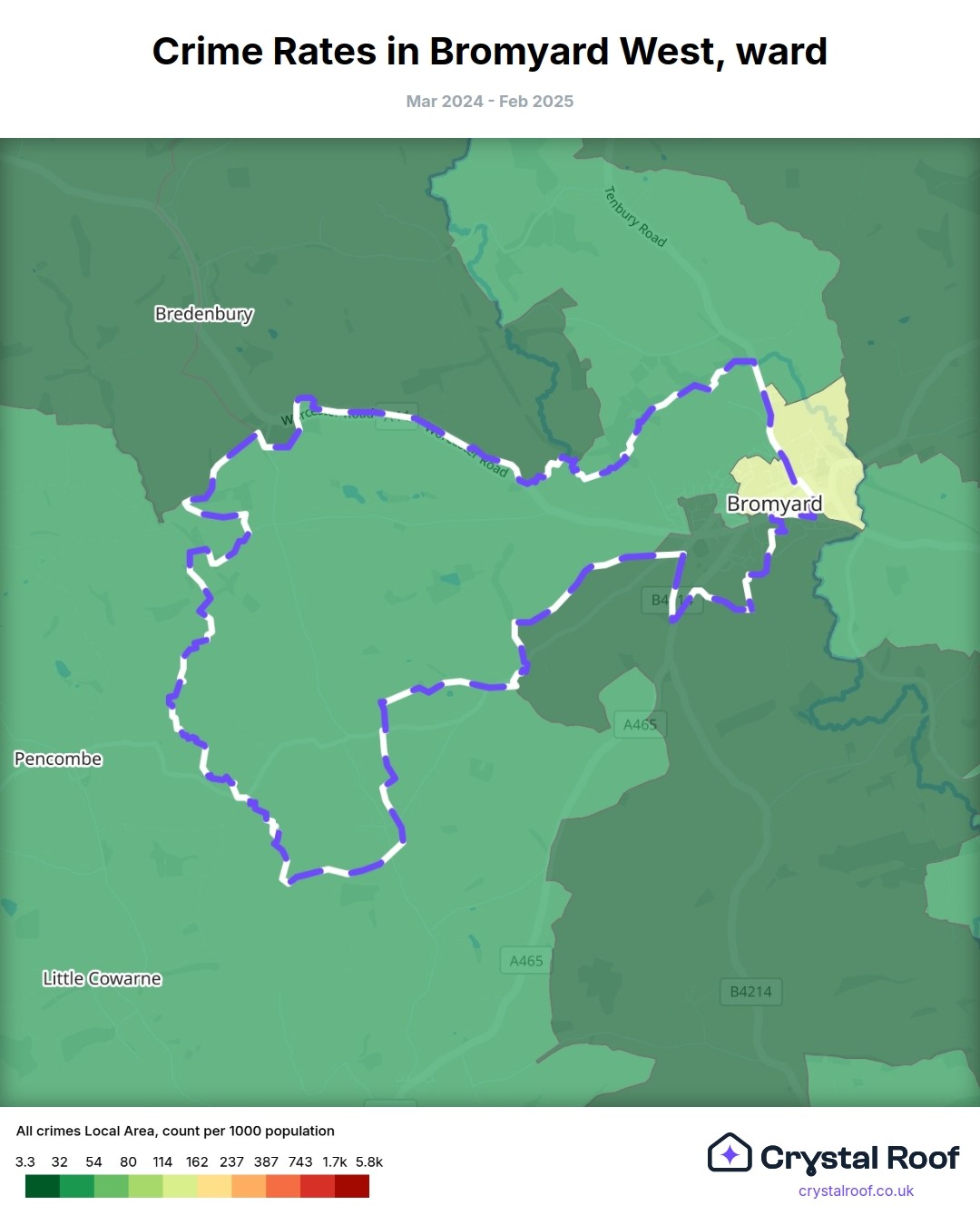 Bromyard West, (ward) includes areas with the following crime ratings (see map):