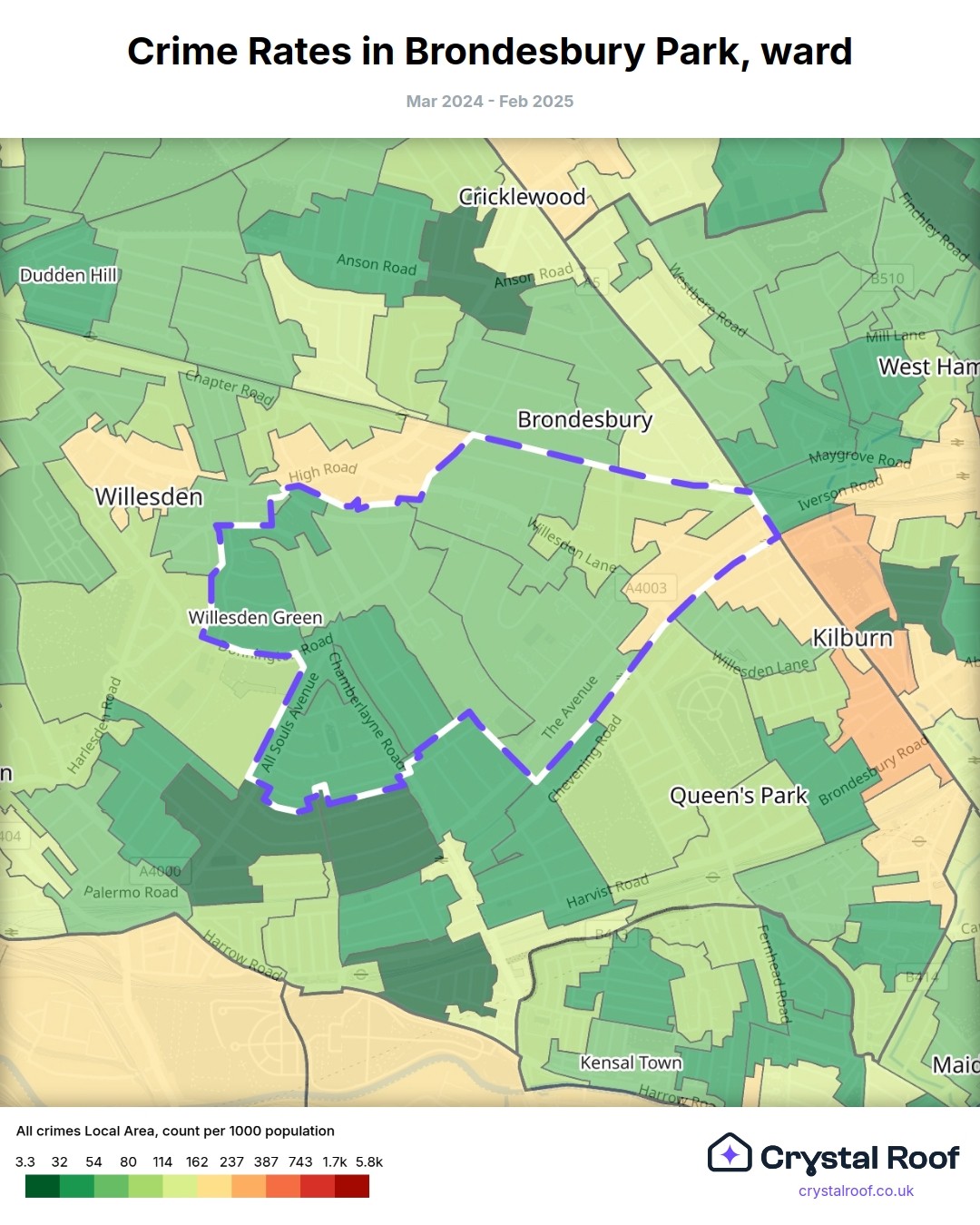 Brondesbury Park, (ward) includes areas with the following crime ratings (see map):