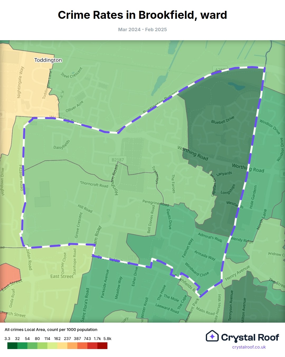 Brookfield, (ward) includes areas with the following crime ratings (see map):