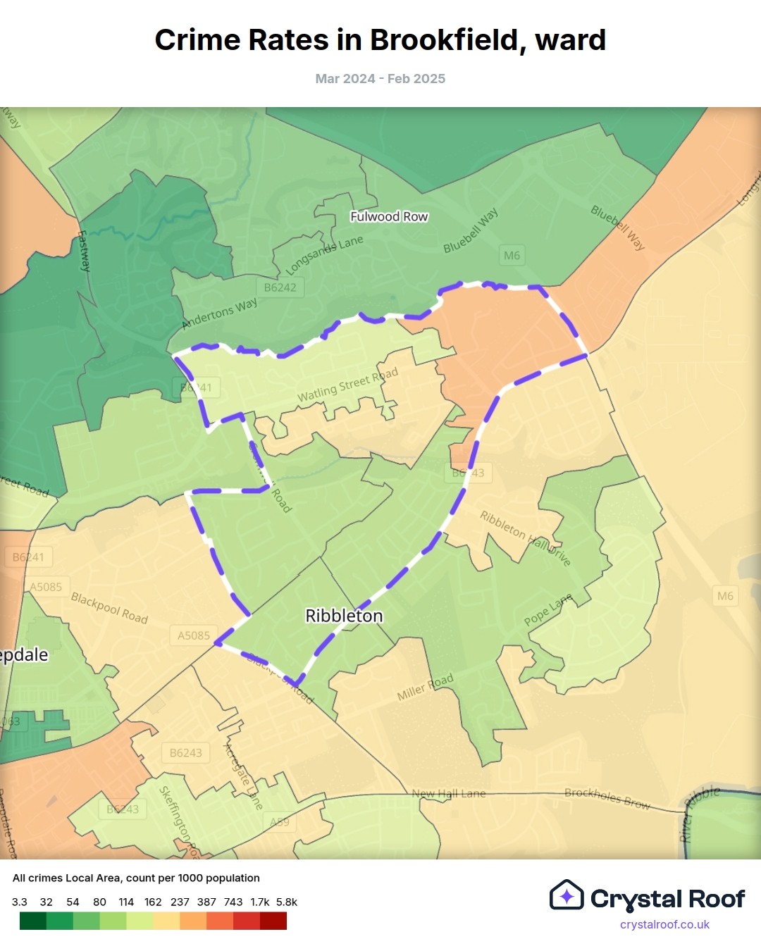 Brookfield (ward) is located within Preston (borough). Annual total crime rate in Preston (borough) is 153 crimes per thousand resident population, which can be rated as 7 out of 10 or high crime level compared to other local authority districts in England and Wales.