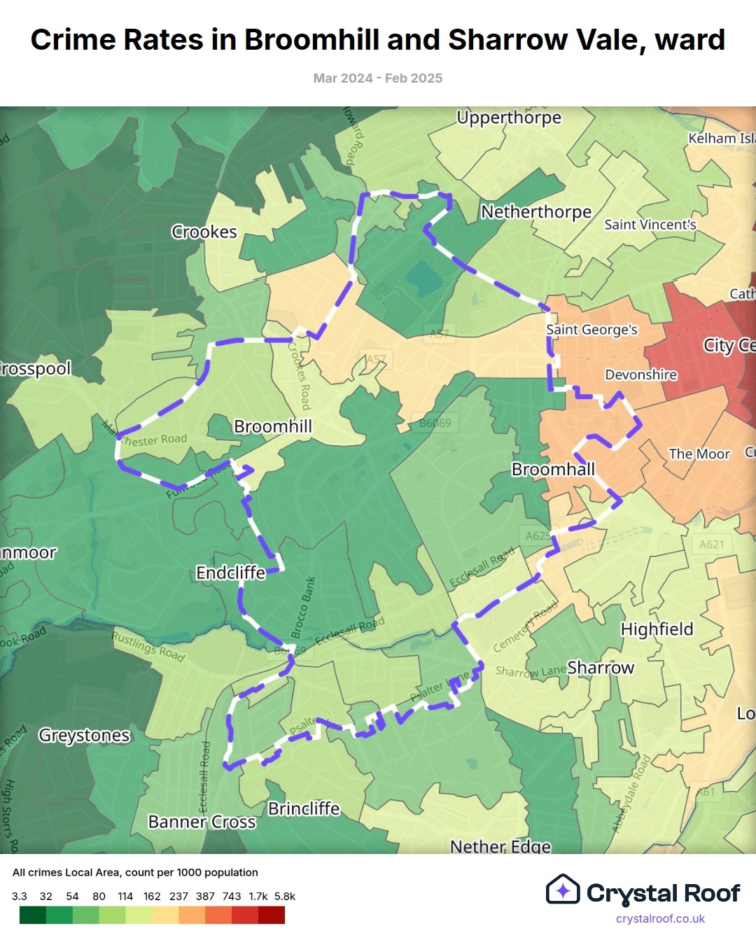 Broomhill and Sharrow Vale, (ward) includes areas with the following crime ratings (see map):