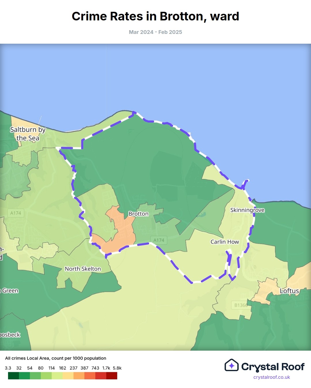 Brotton, (ward) includes areas with the following crime ratings (see map):