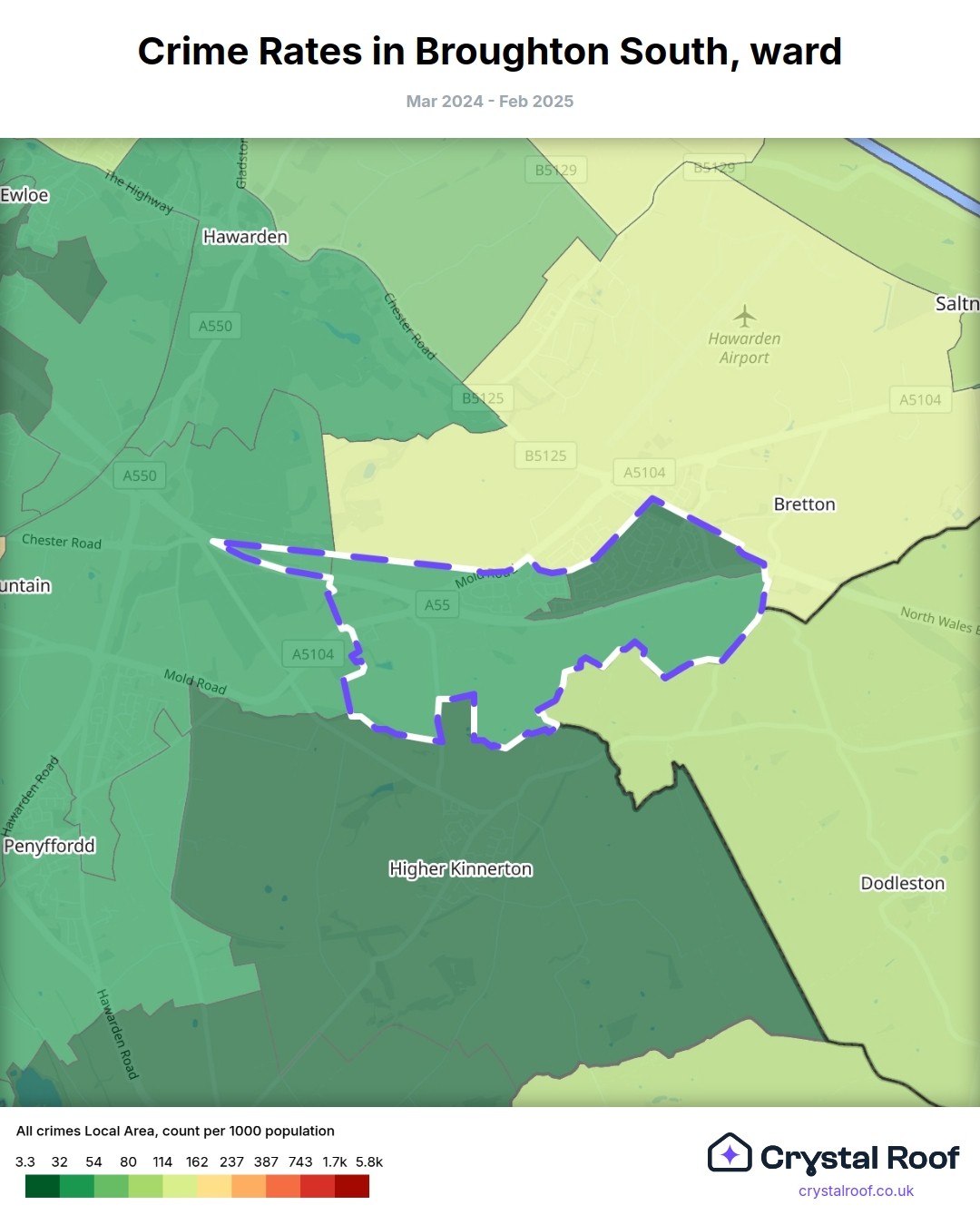 Broughton South (ward) is located within Flintshire (borough). Annual total crime rate in Flintshire (borough) is 79.5 crimes per thousand resident population, which can be rated as 3 out of 10 or low crime level compared to other local authority districts in England and Wales.