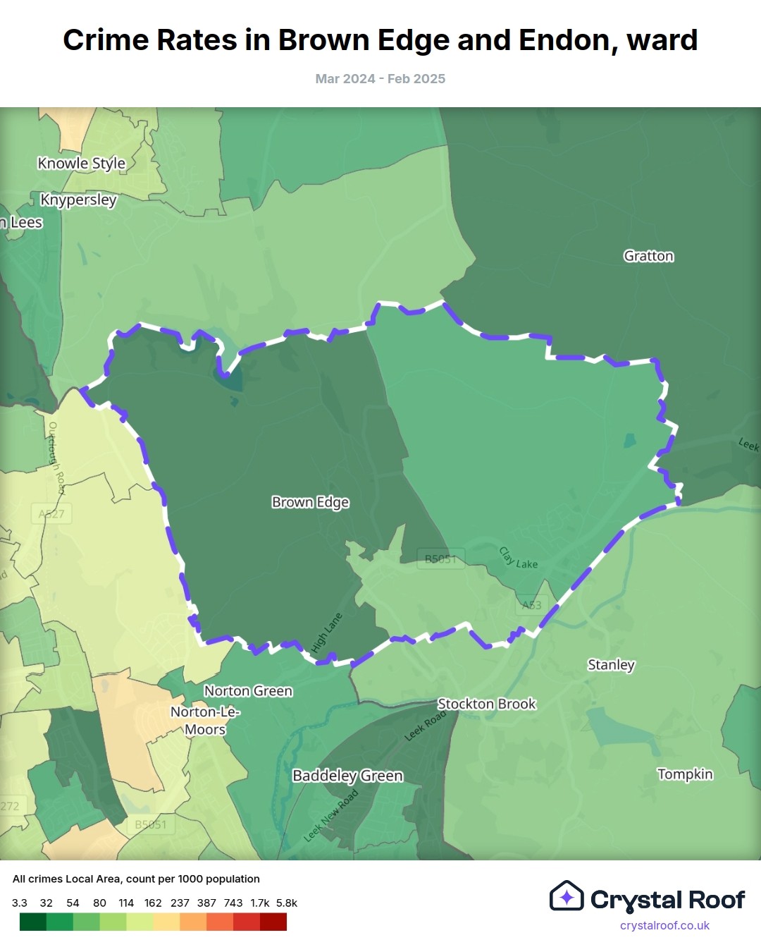 Brown Edge and Endon, (ward) includes areas with the following crime ratings (see map):