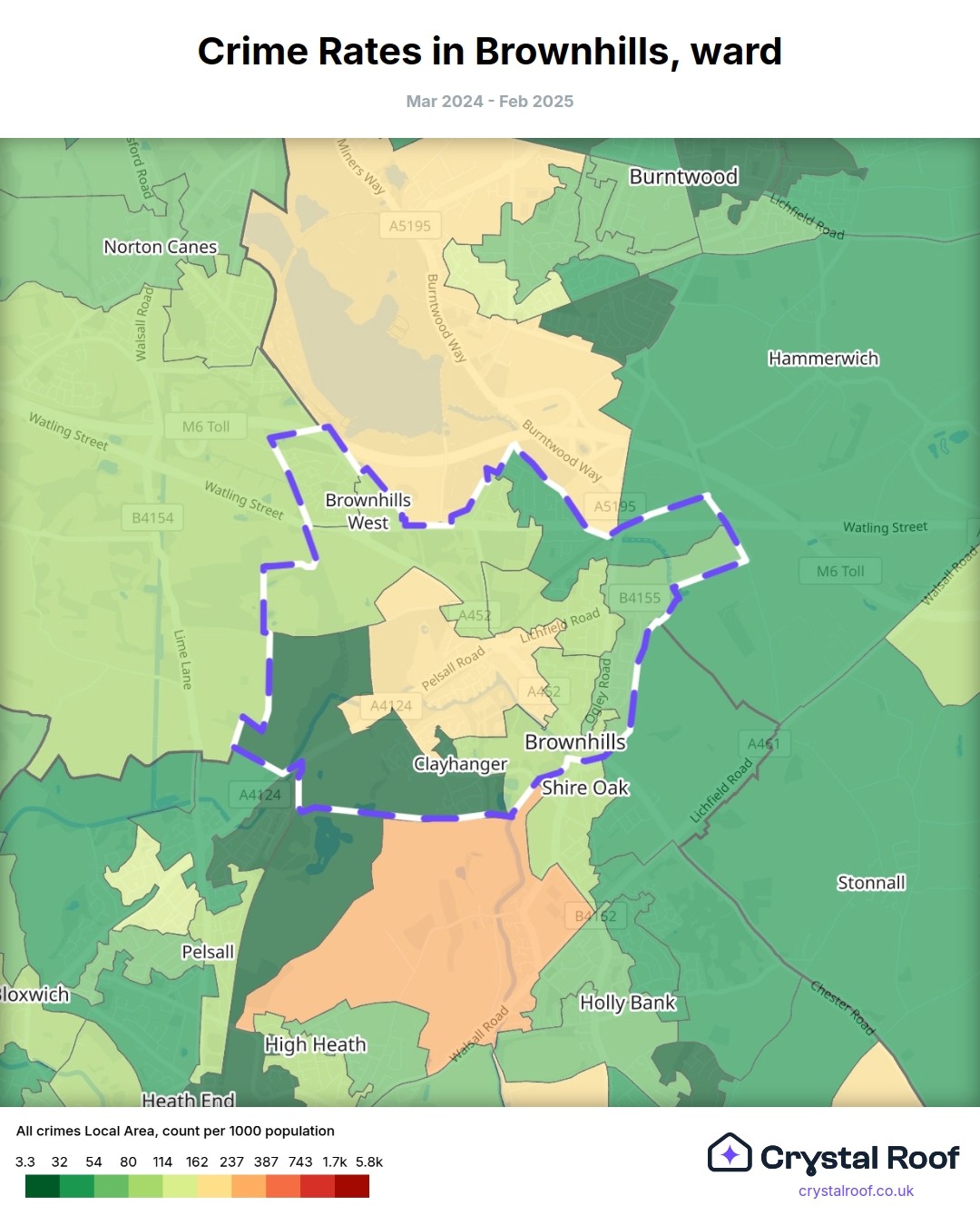 Brownhills, (ward) includes areas with the following crime ratings (see map):