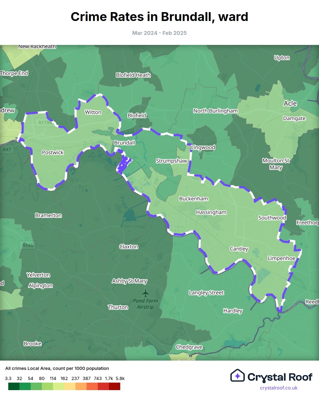 The figures in grey indicate the relative ratings of Brundall (ward) for a specific crime type compared to other wards in England and Wales.