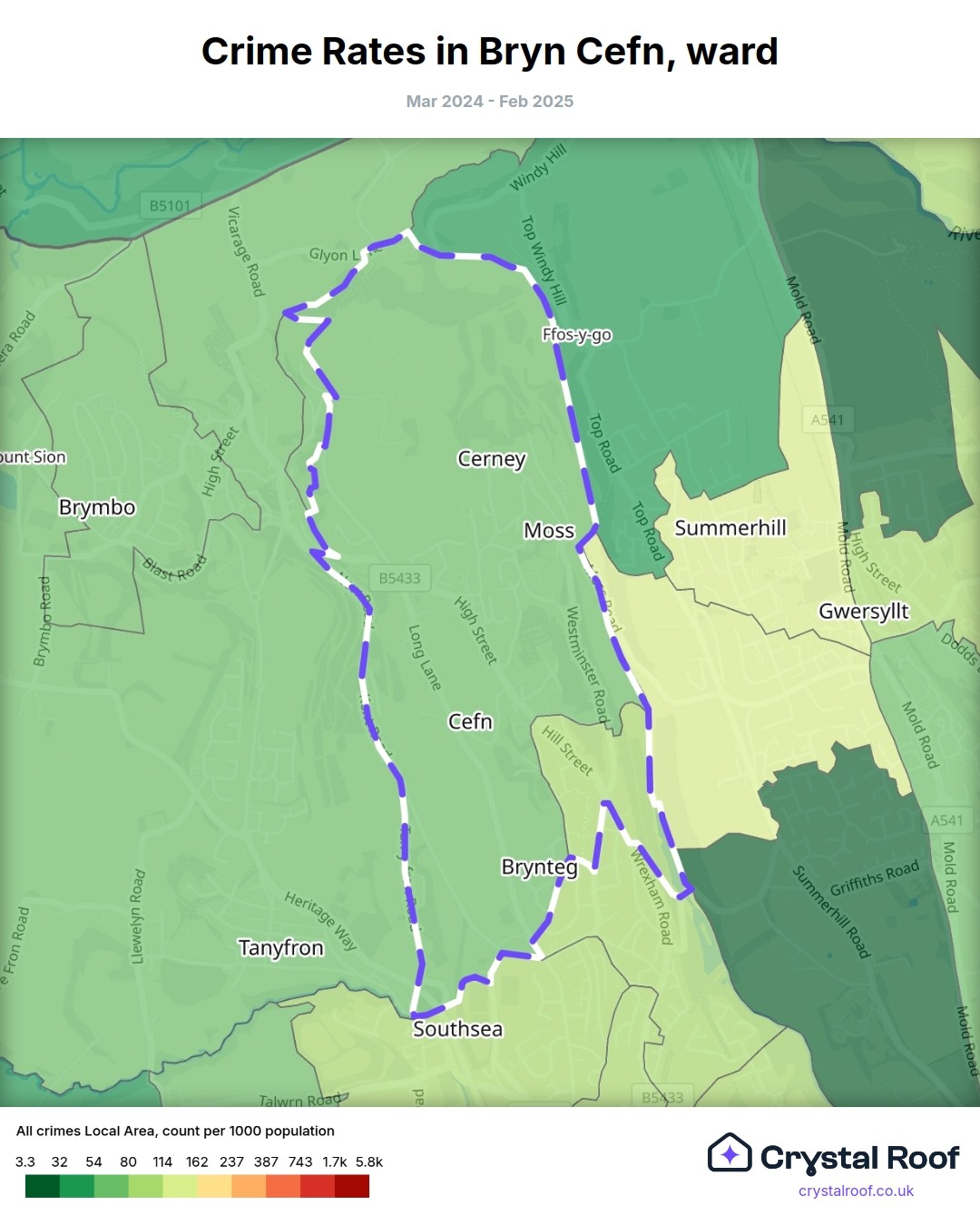 Bryn Cefn (ward) is located within Wrexham (borough). Annual total crime rate in Wrexham (borough) is 105 crimes per thousand resident population, which can be rated as 5 out of 10 or medium crime level compared to other local authority districts in England and Wales.