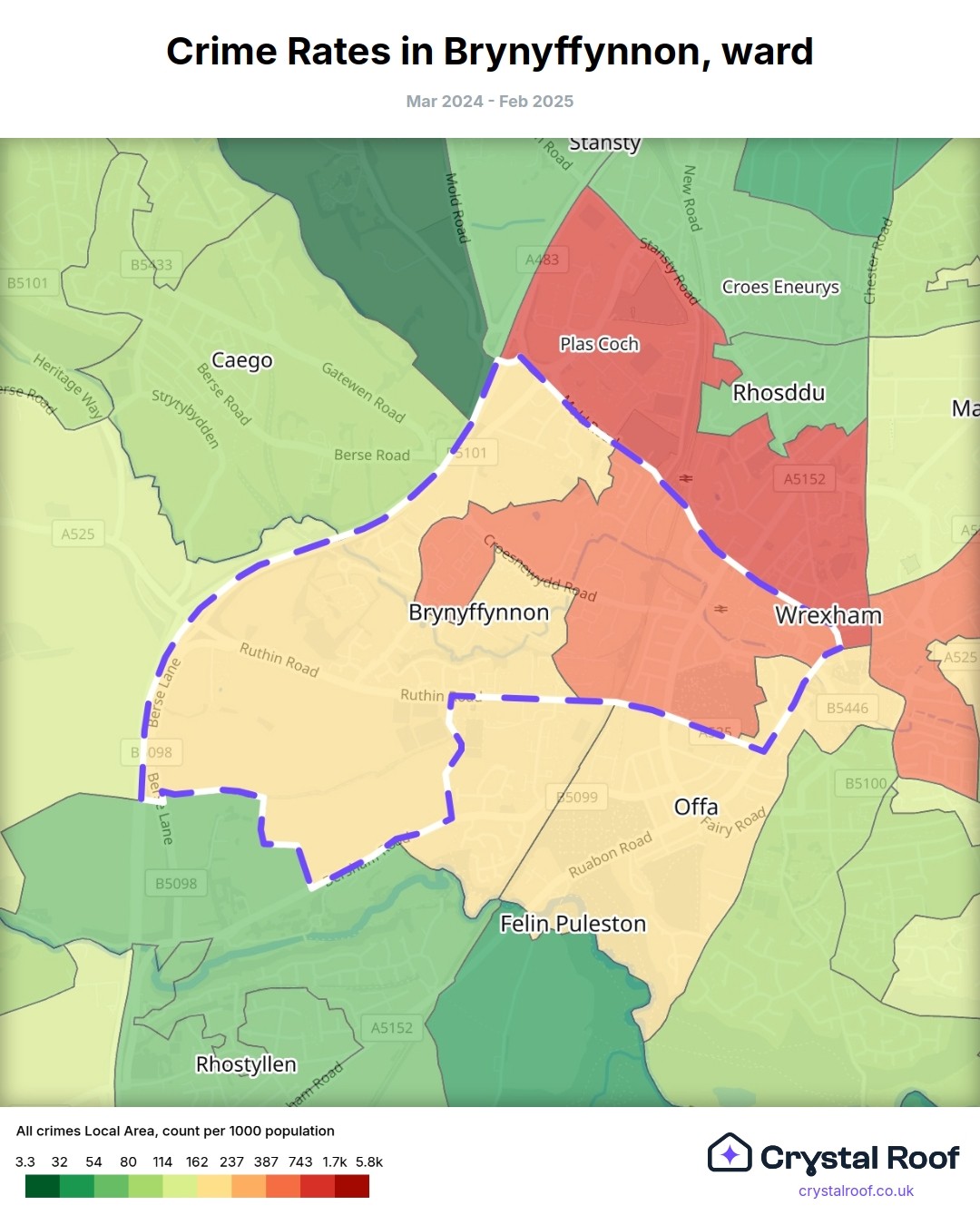 Brynyffynnon, (ward) includes areas with the following crime ratings (see map):