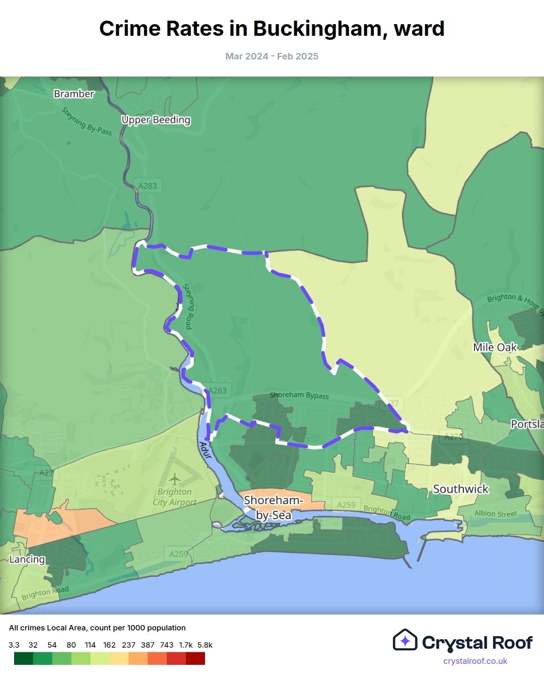 Buckingham (ward) is located within Adur (borough). Annual total crime rate in Adur (borough) is 69.8 crimes per thousand resident population, which can be rated as 2 out of 10 or low crime level compared to other local authority districts in England and Wales.