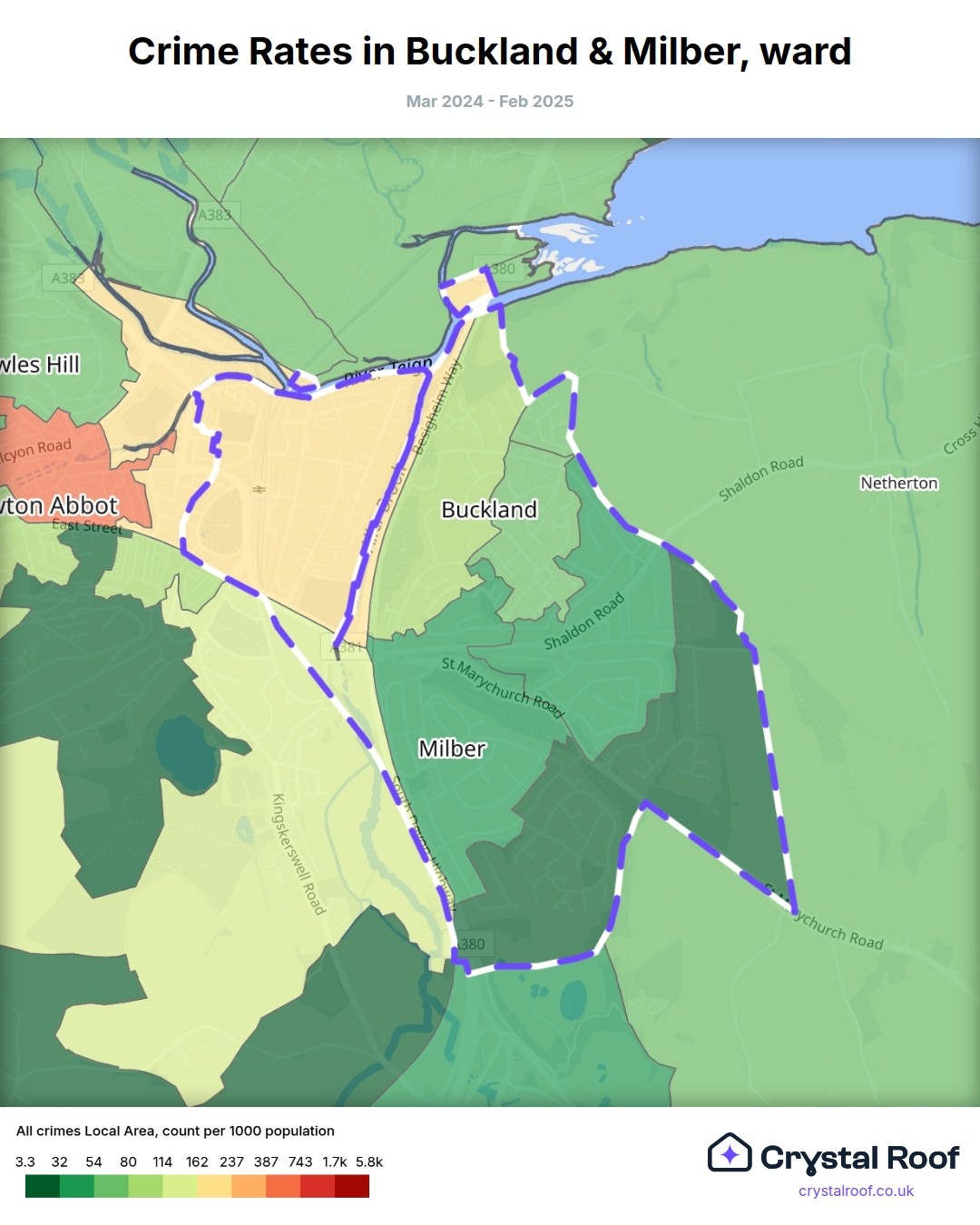 Buckland & Milber, (ward) includes areas with the following crime ratings (see map):