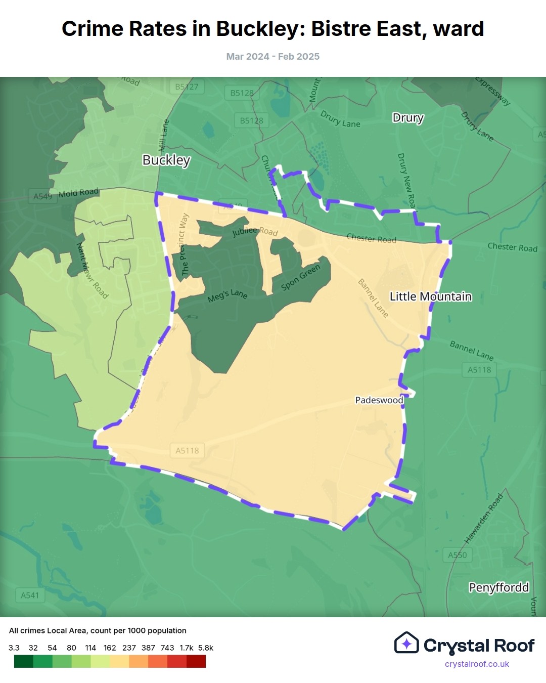 Buckley: Bistre East, (ward) includes areas with the following crime ratings (see map):