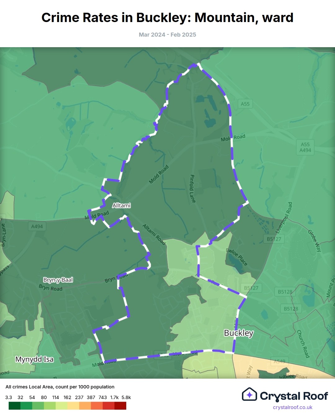 Buckley: Mountain (ward) is located within Flintshire (borough). Annual total crime rate in Flintshire (borough) is 79.5 crimes per thousand resident population, which can be rated as 3 out of 10 or low crime level compared to other local authority districts in England and Wales.