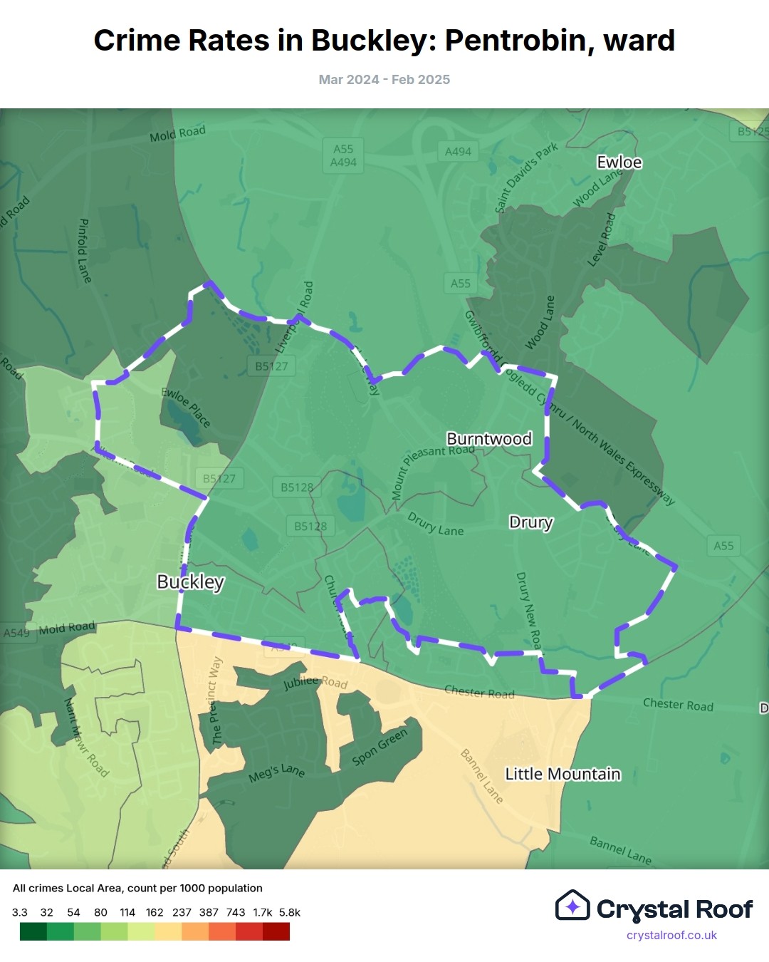 Buckley: Pentrobin, (ward) includes areas with the following crime ratings (see map):