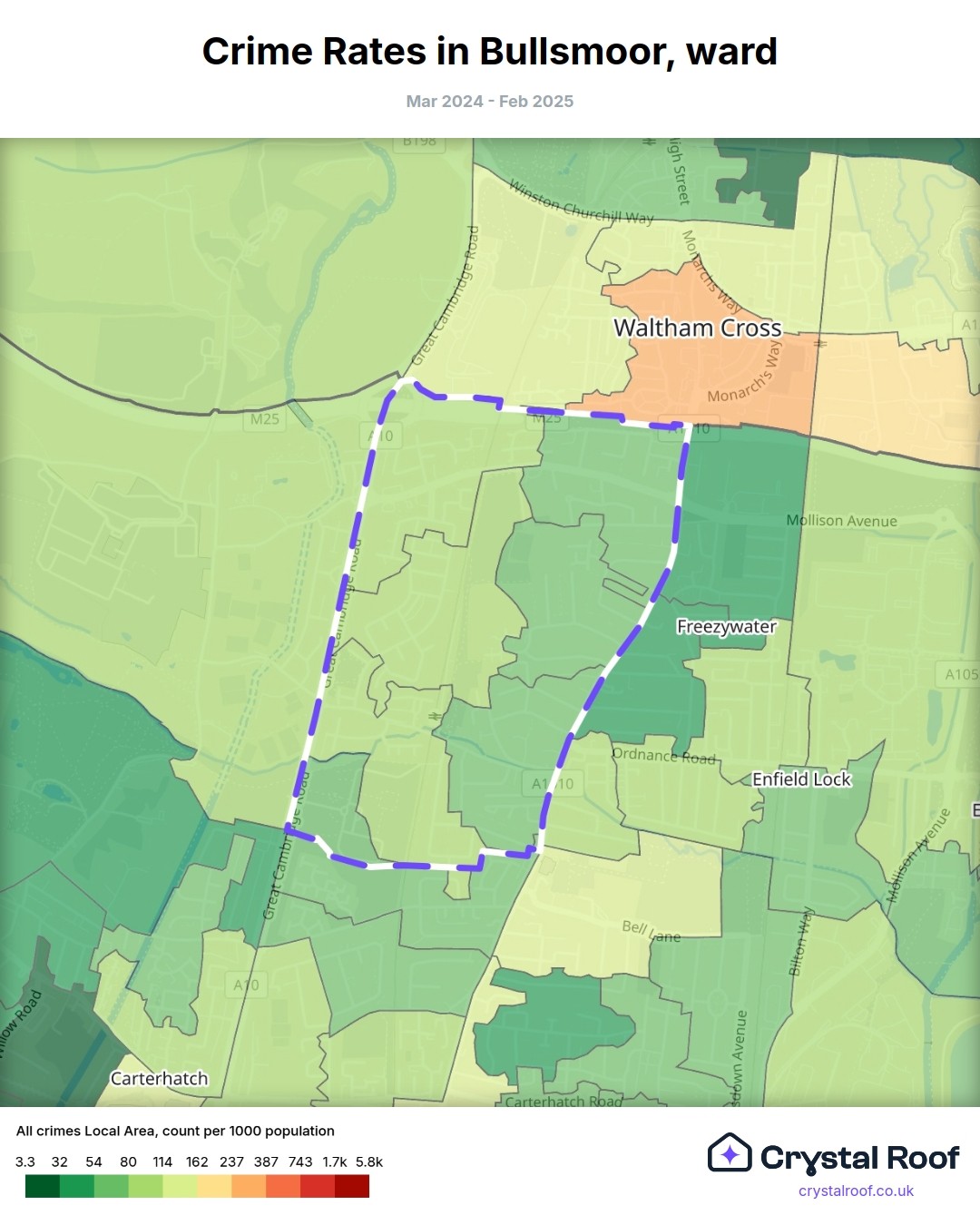 Bullsmoor (ward) is located within Enfield (borough). Annual total crime rate in Enfield (borough) is 113 crimes per thousand resident population, which can be rated as 5 out of 10 or medium crime level compared to other local authority districts in England and Wales.