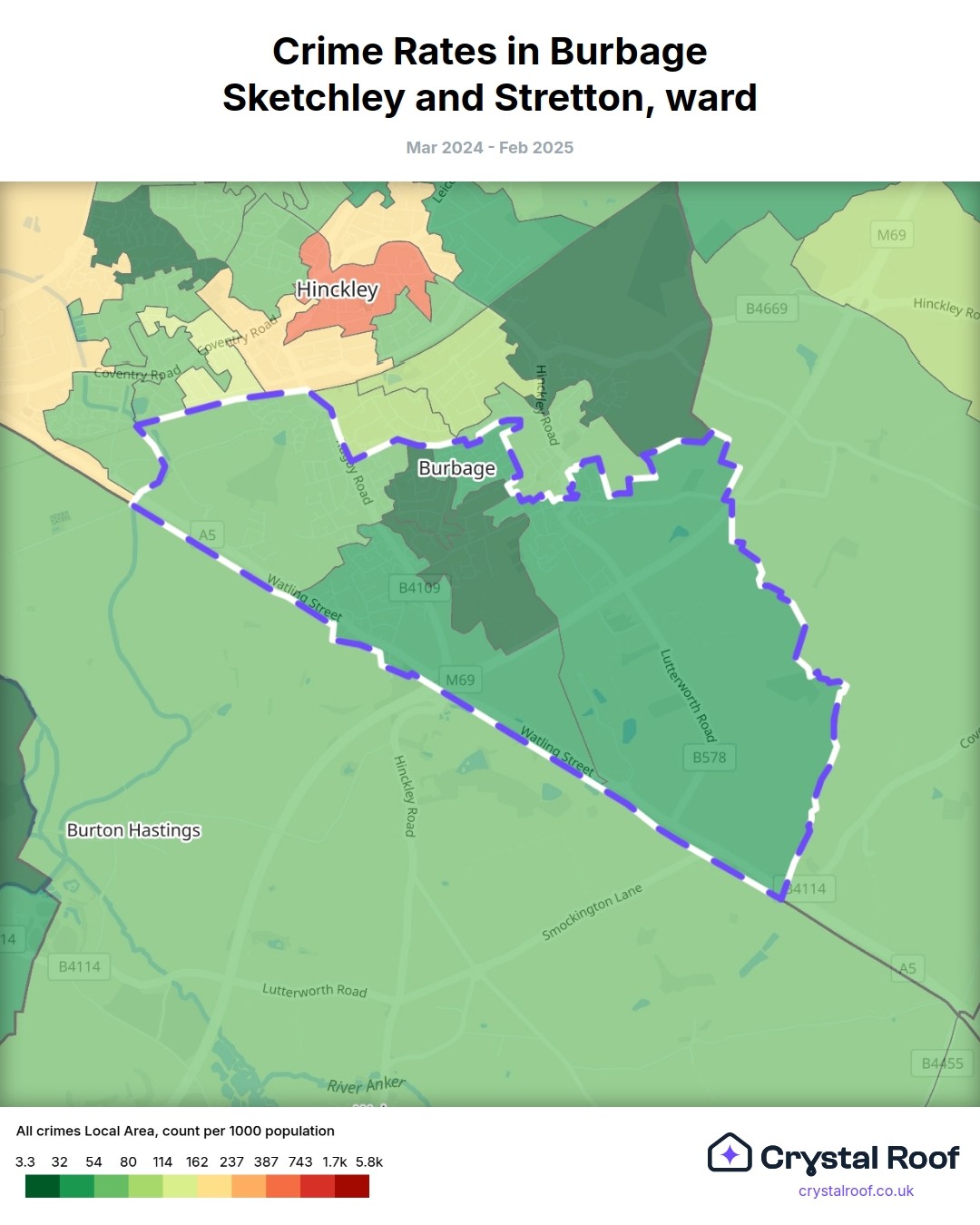 Burbage Sketchley and Stretton, (ward) includes areas with the following crime ratings (see map):