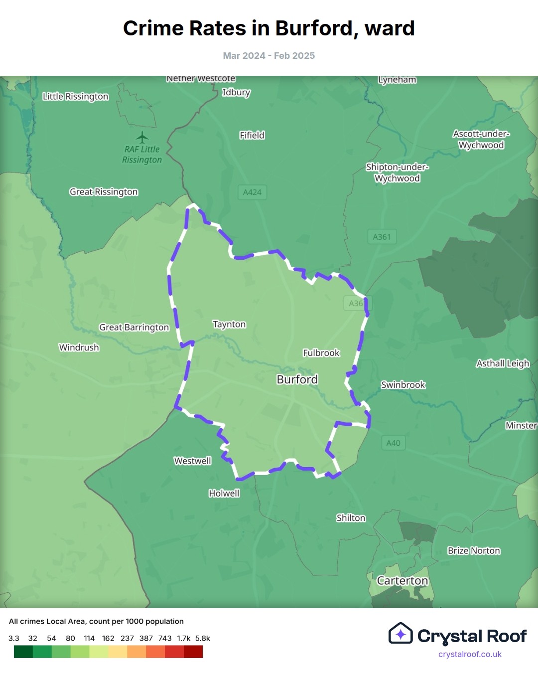 Burford, (ward) includes areas with the following crime ratings (see map):