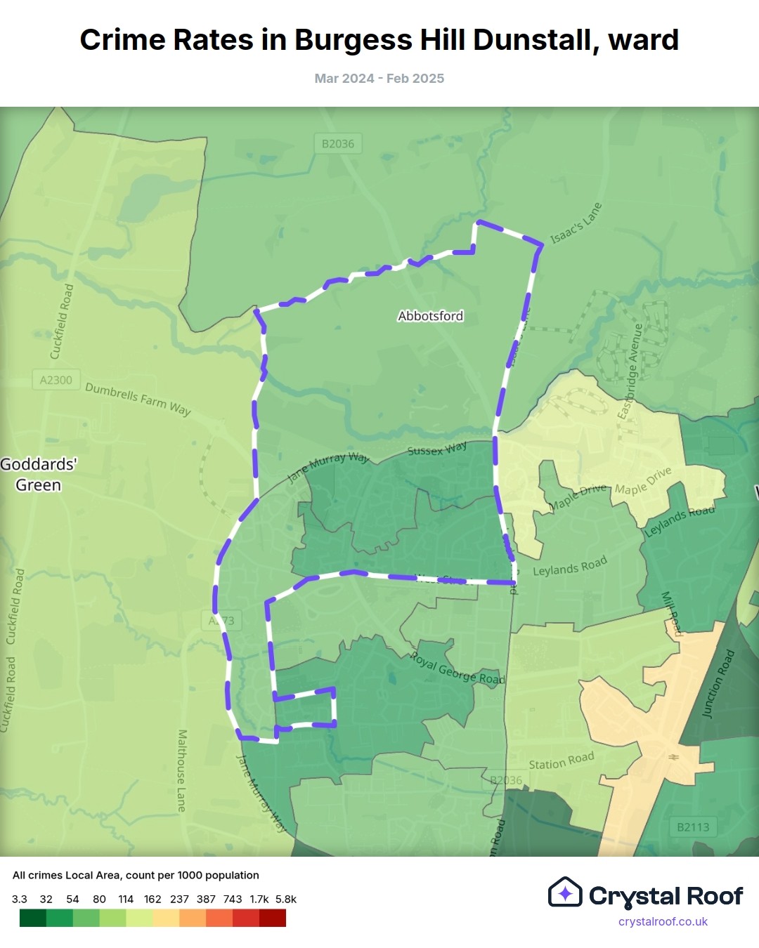 Burgess Hill Dunstall, (ward) includes areas with the following crime ratings (see map):