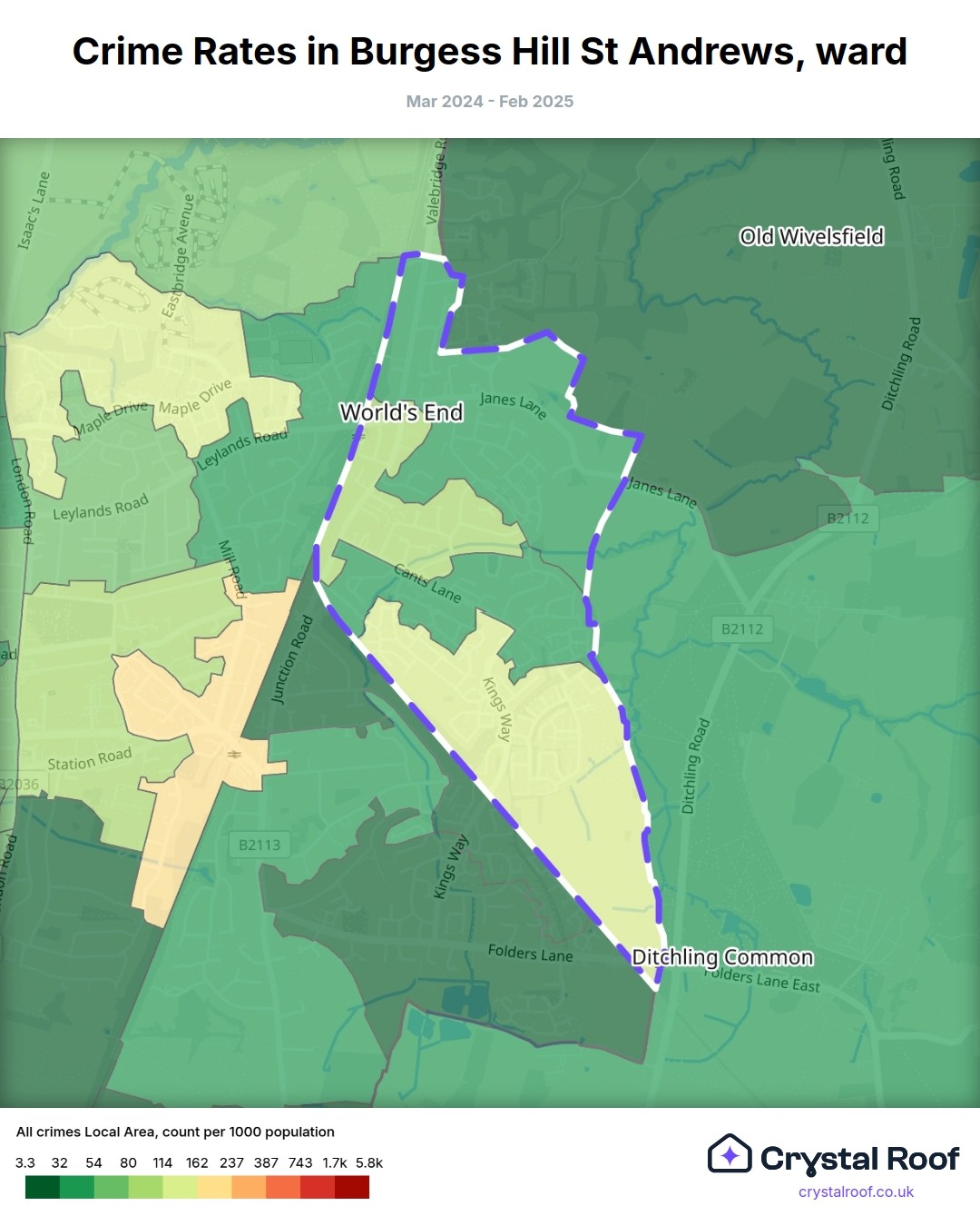 Burgess Hill St Andrews, (ward) includes areas with the following crime ratings (see map):