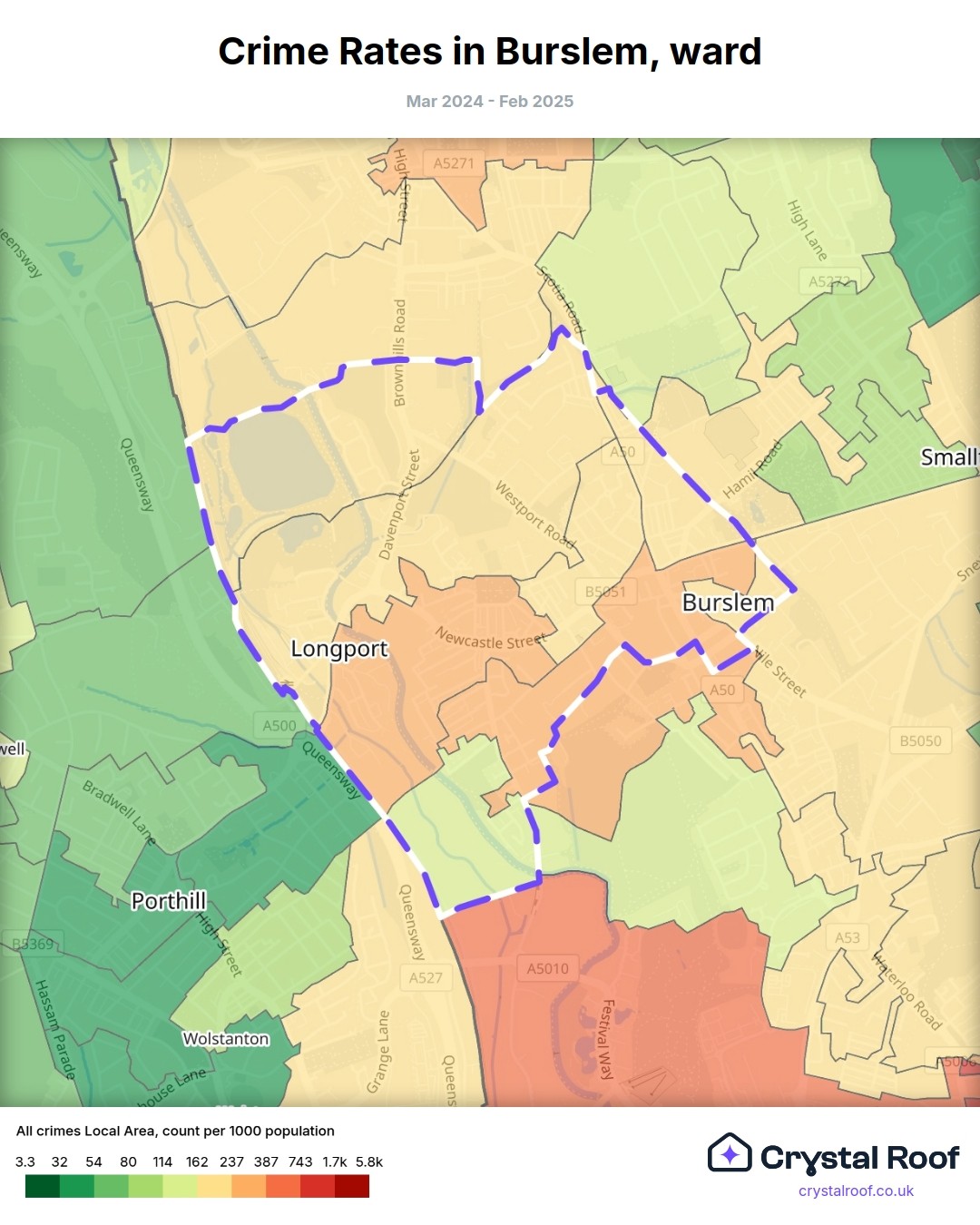 Burslem, (ward) includes areas with the following crime ratings (see map):