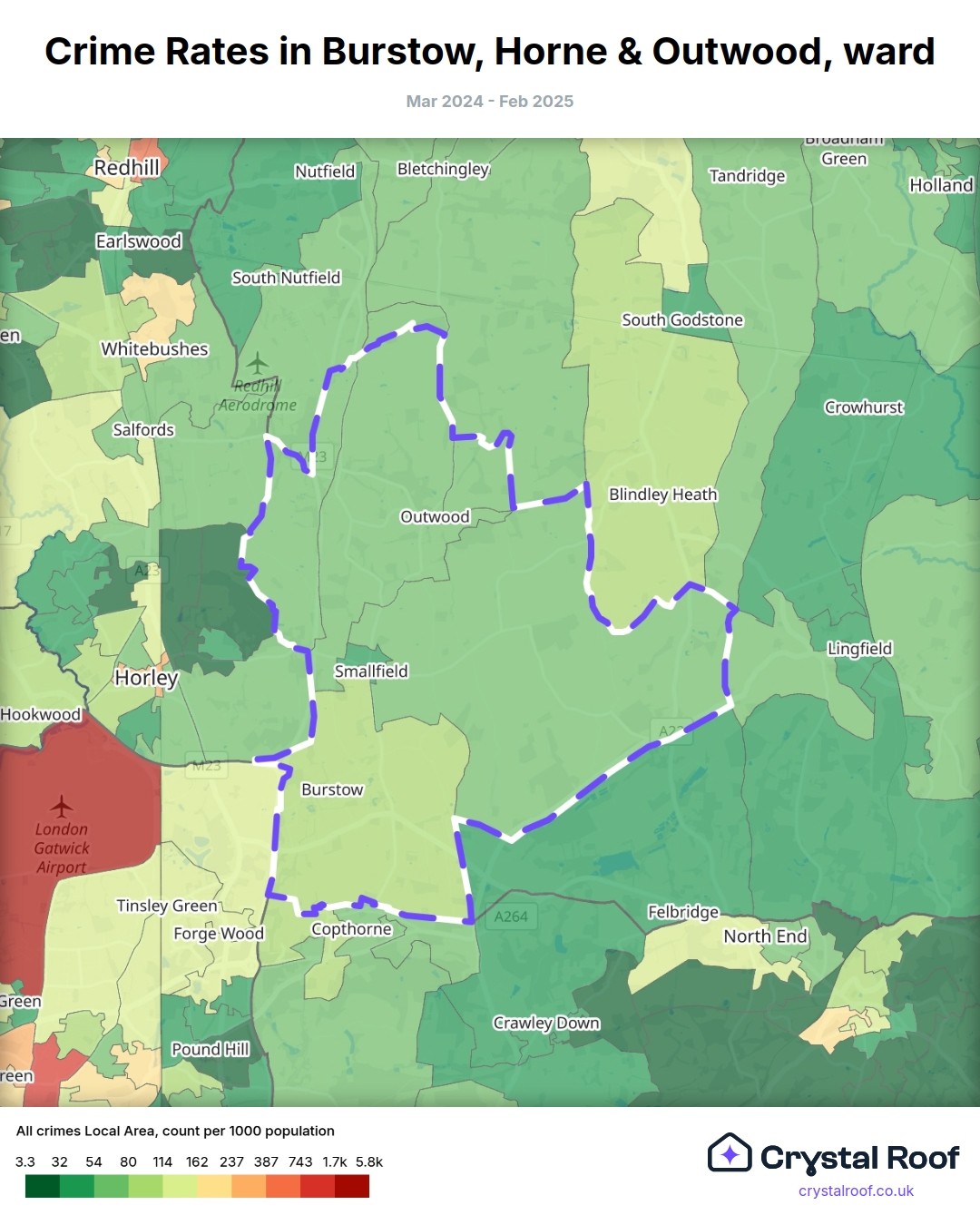 Burstow, Horne & Outwood, (ward) includes areas with the following crime ratings (see map):