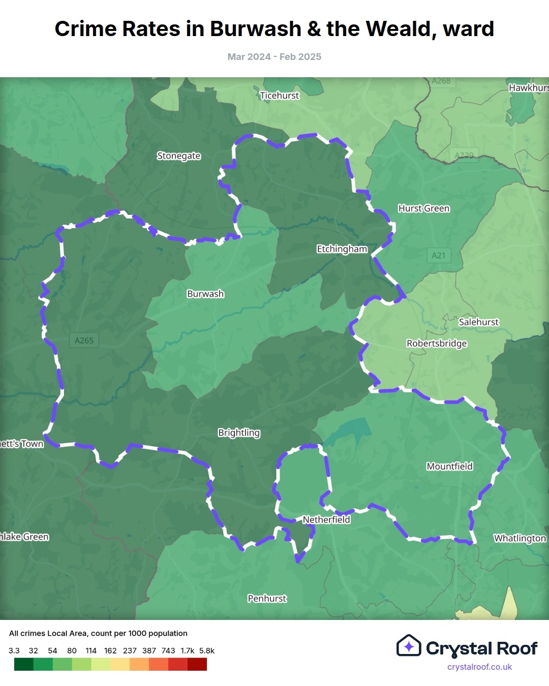 Burwash & the Weald, (ward) includes areas with the following crime ratings (see map):