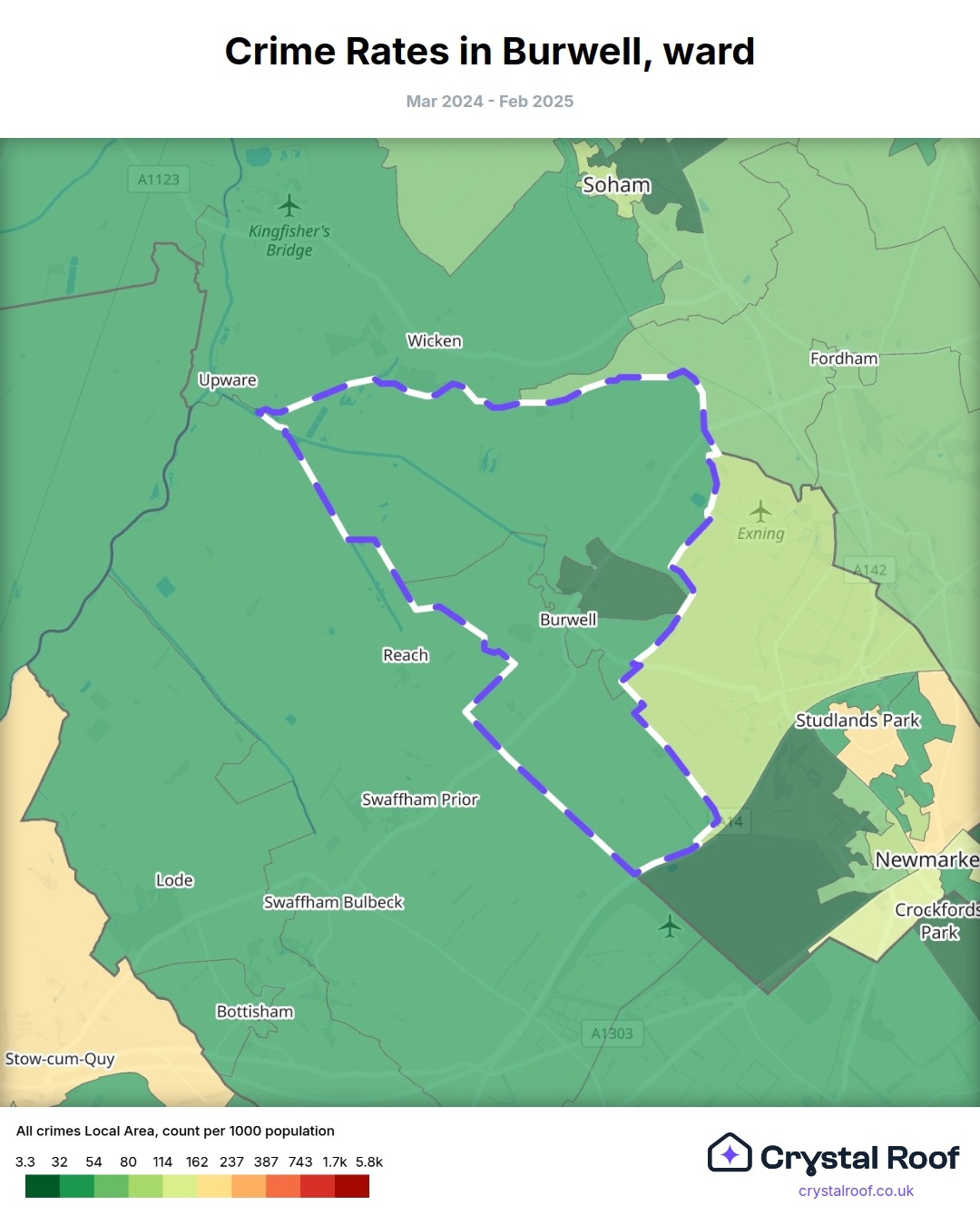 The figures in grey indicate the relative ratings of Burwell (ward) for a specific crime type compared to other wards in England and Wales.