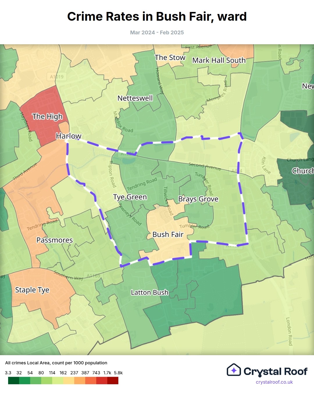 Bush Fair, (ward) includes areas with the following crime ratings (see map):