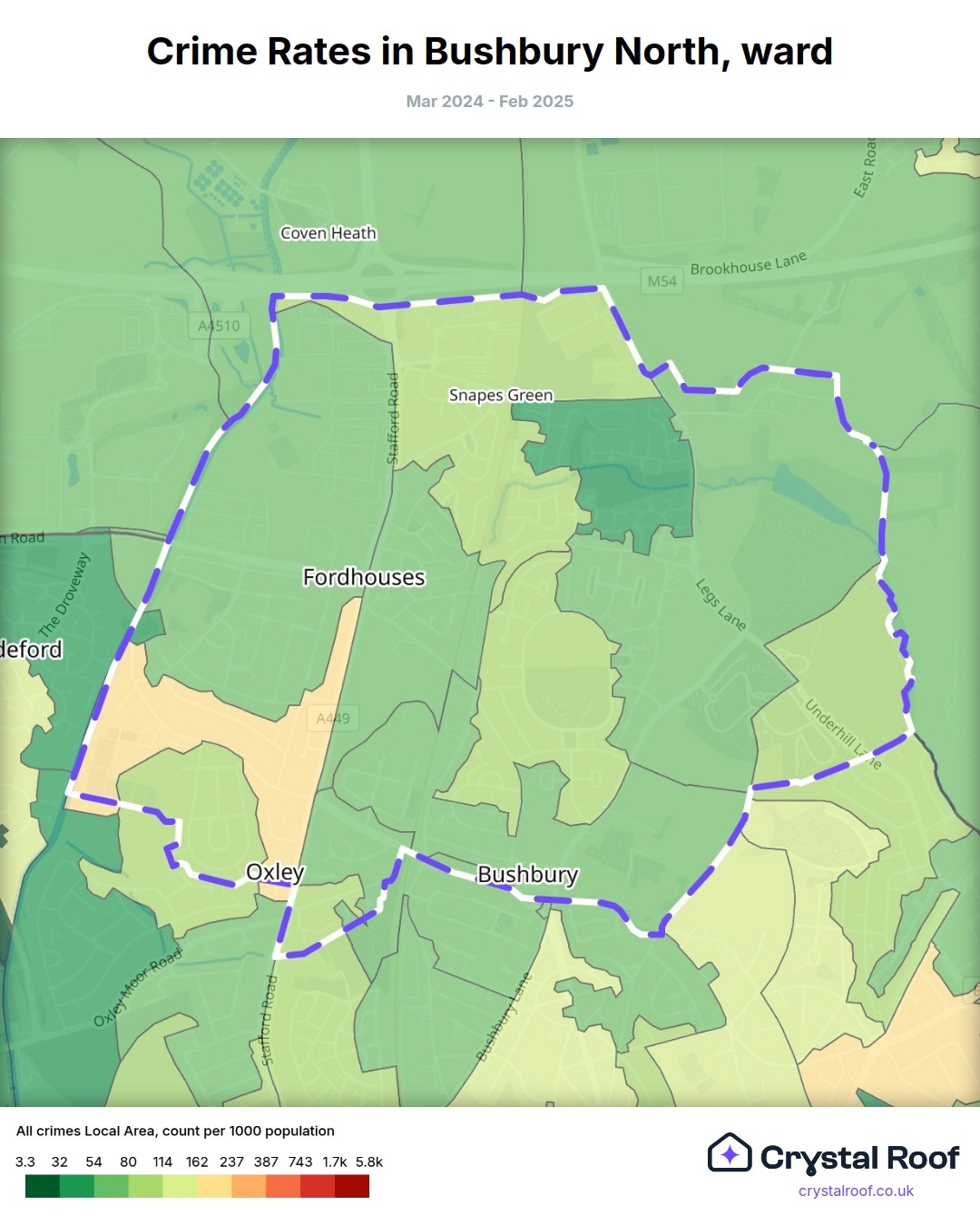 The figures in grey indicate the relative ratings of Bushbury North (ward) for a specific crime type compared to other wards in England and Wales.