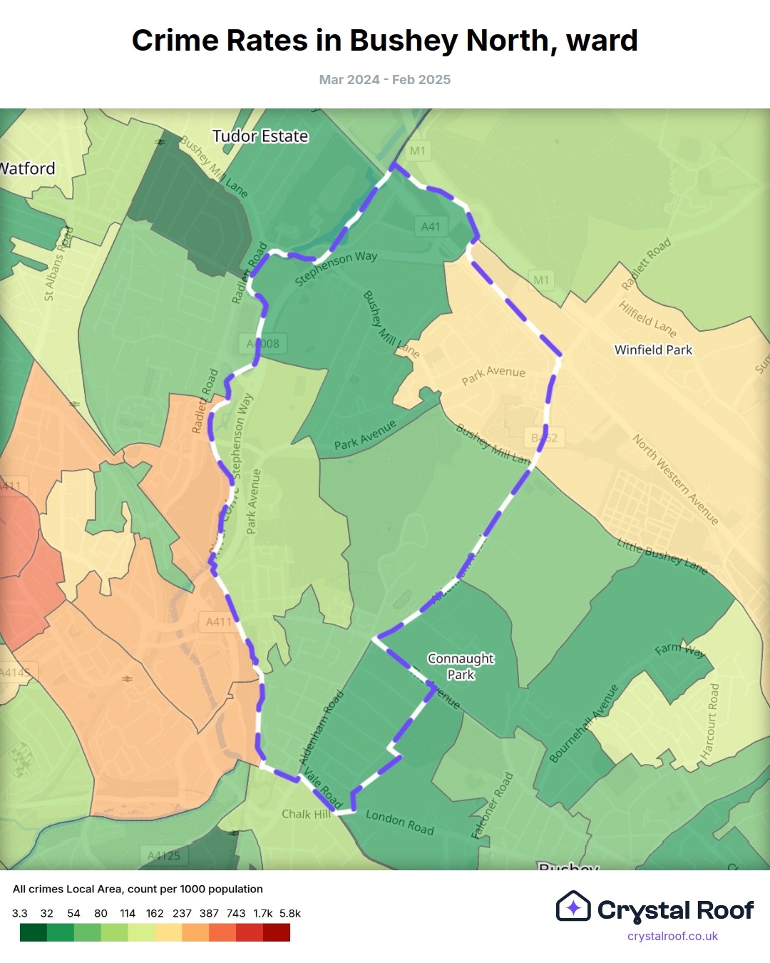 Bushey North, (ward) includes areas with the following crime ratings (see map):