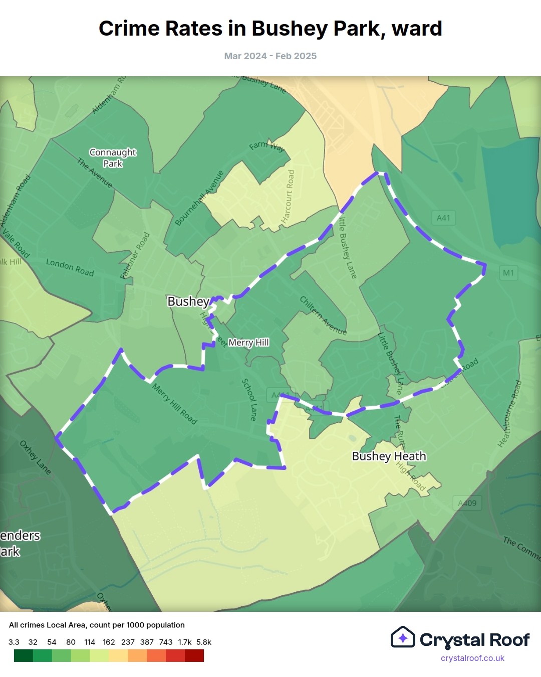 Bushey Park, (ward) includes areas with the following crime ratings (see map):