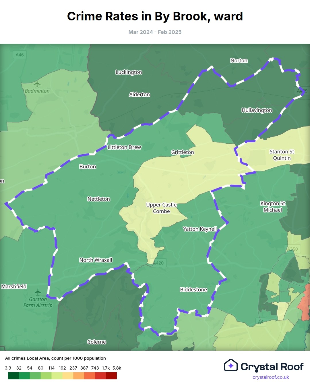 By Brook (ward) is located within Wiltshire (borough). Annual total crime rate in Wiltshire (borough) is 62.1 crimes per thousand resident population, which can be rated as 2 out of 10 or low crime level compared to other local authority districts in England and Wales.