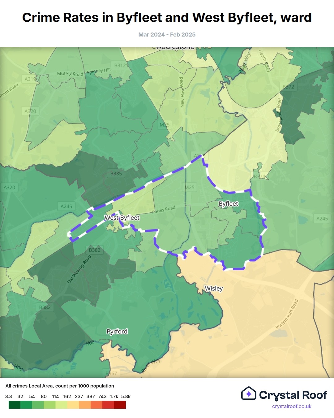 Byfleet and West Byfleet, (ward) includes areas with the following crime ratings (see map):