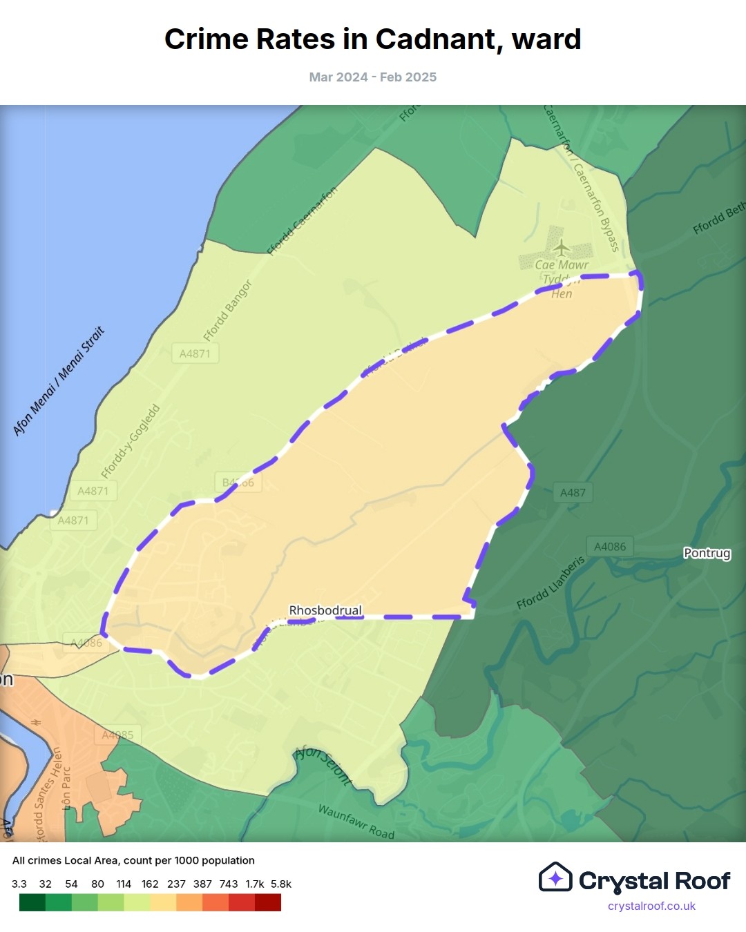 Cadnant (ward) is located within Gwynedd (borough). Annual total crime rate in Gwynedd (borough) is 88.3 crimes per thousand resident population, which can be rated as 4 out of 10 or low crime level compared to other local authority districts in England and Wales.