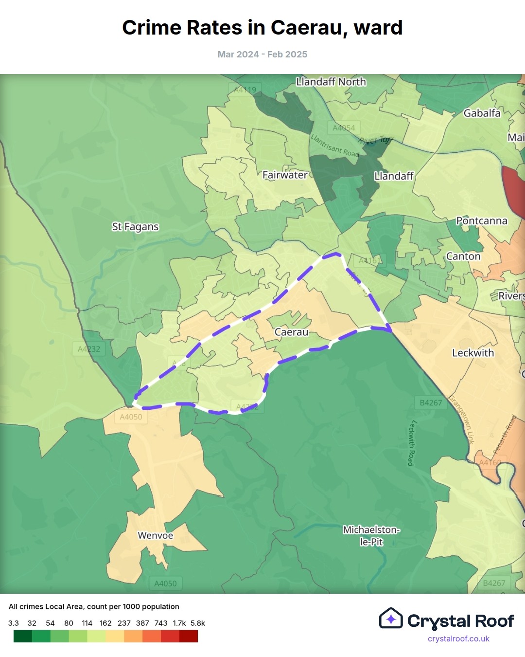 Caerau (ward) is located within Cardiff (borough). Annual total crime rate in Cardiff (borough) is 117 crimes per thousand resident population, which can be rated as 6 out of 10 or medium crime level compared to other local authority districts in England and Wales.