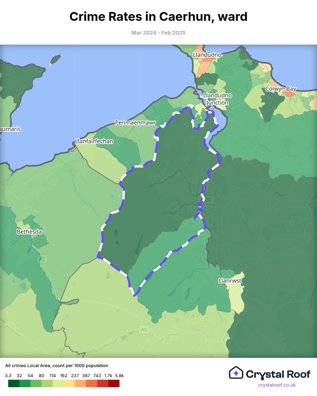 Caerhun, (ward) includes areas with the following crime ratings (see map):