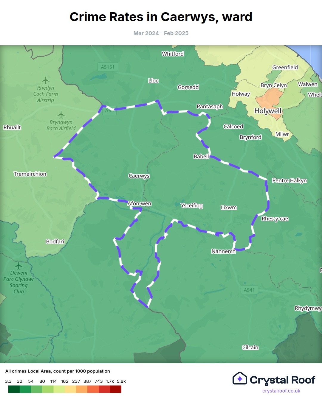 Caerwys, (ward) includes areas with the following crime ratings (see map):