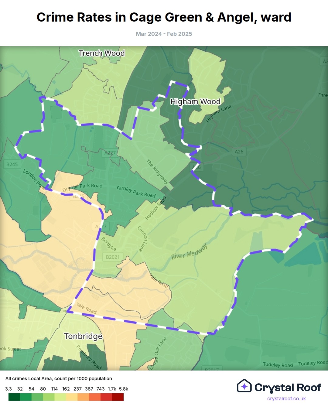 Cage Green & Angel (ward) is located within Tonbridge and Malling (borough). Annual total crime rate in Tonbridge and Malling (borough) is 69 crimes per thousand resident population, which can be rated as 2 out of 10 or low crime level compared to other local authority districts in England and Wales.