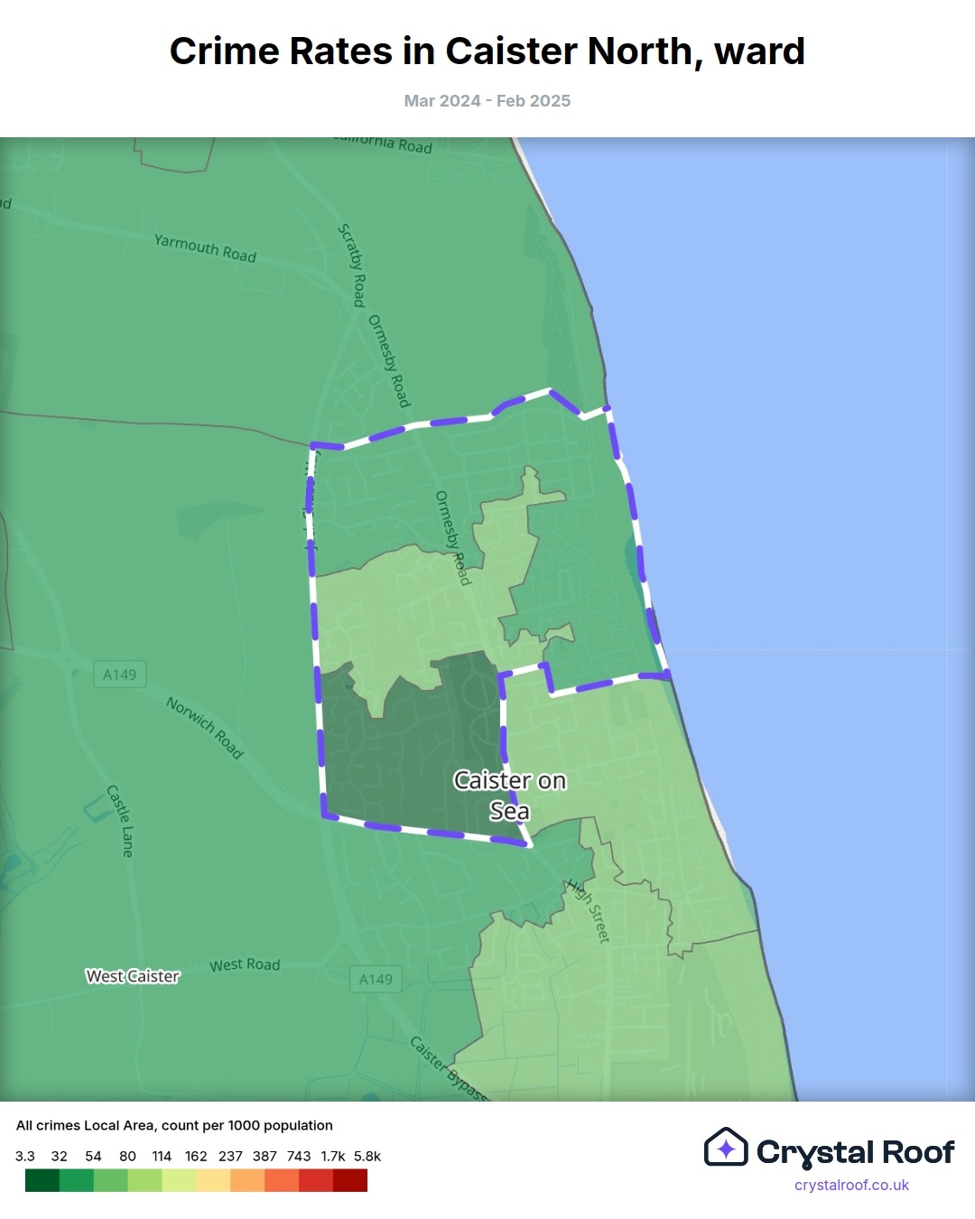 Caister North, (ward) includes areas with the following crime ratings (see map):