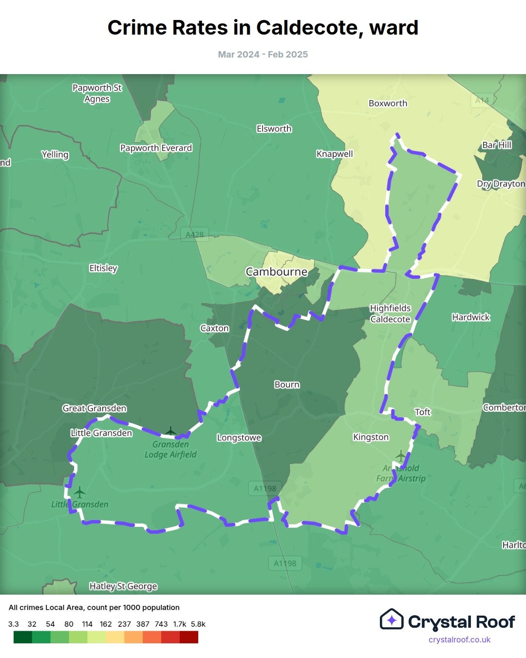 Caldecote (ward) is located within South Cambridgeshire (borough). Annual total crime rate in South Cambridgeshire (borough) is 57.1 crimes per thousand resident population, which can be rated as 1 out of 10 or low crime level compared to other local authority districts in England and Wales.
