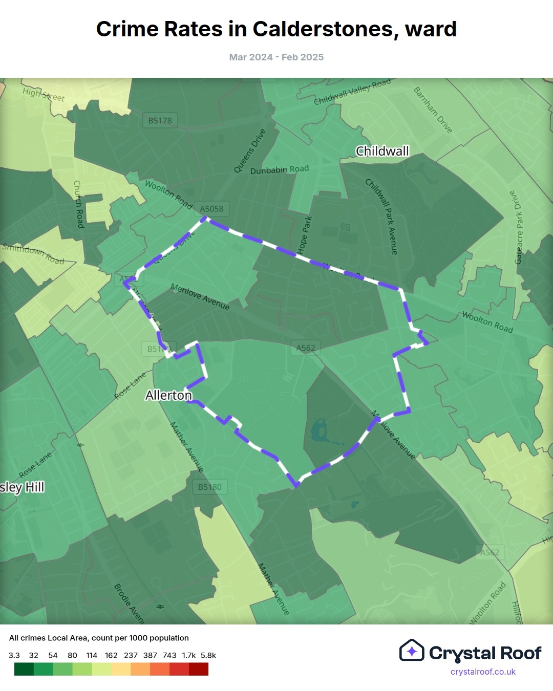 Calderstones, (ward) includes areas with the following crime ratings (see map):