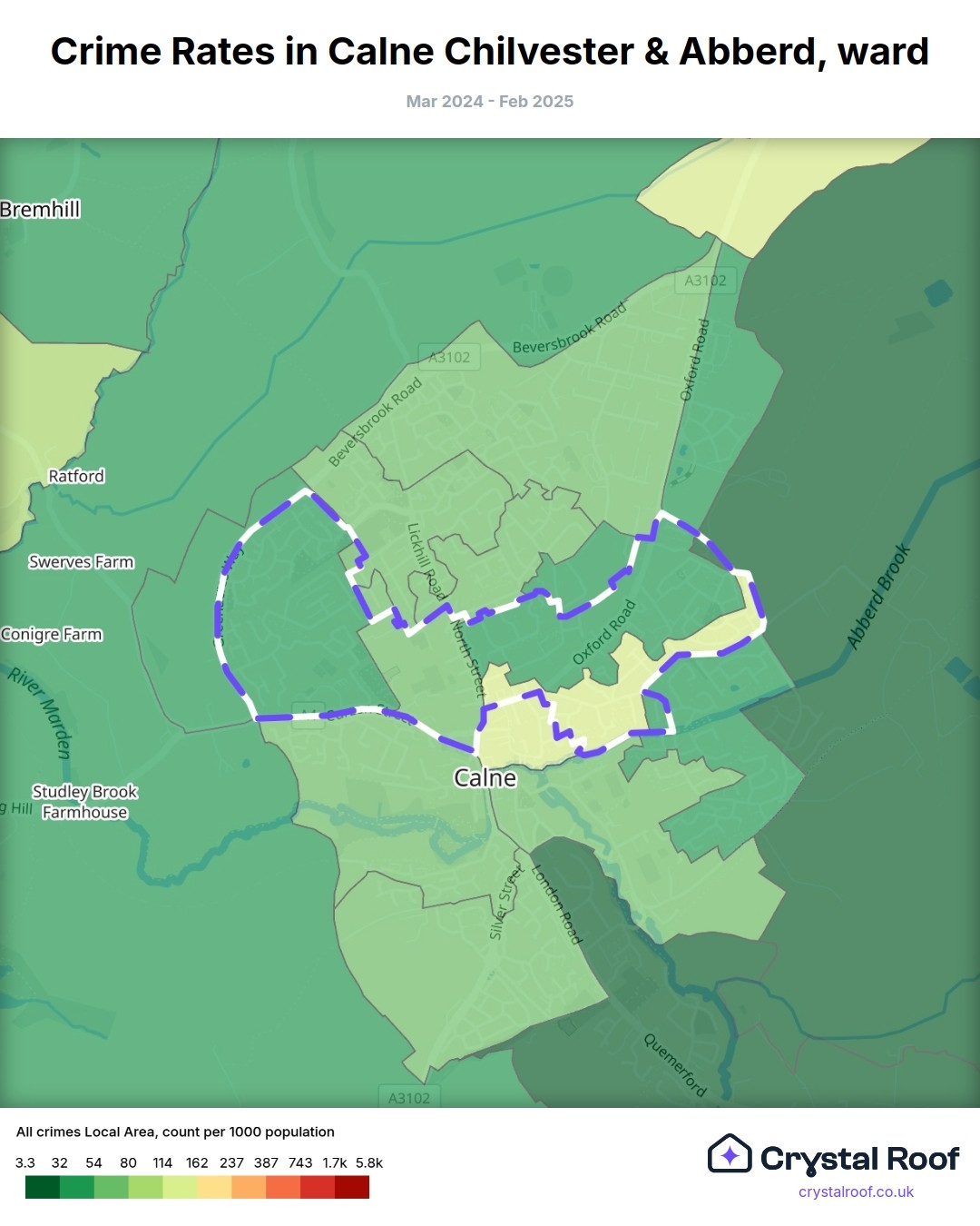 Calne Chilvester & Abberd, (ward) includes areas with the following crime ratings (see map):