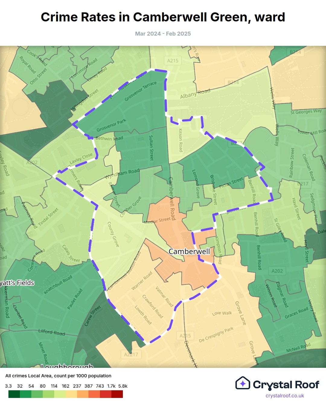 Camberwell Green, (ward) includes areas with the following crime ratings (see map):