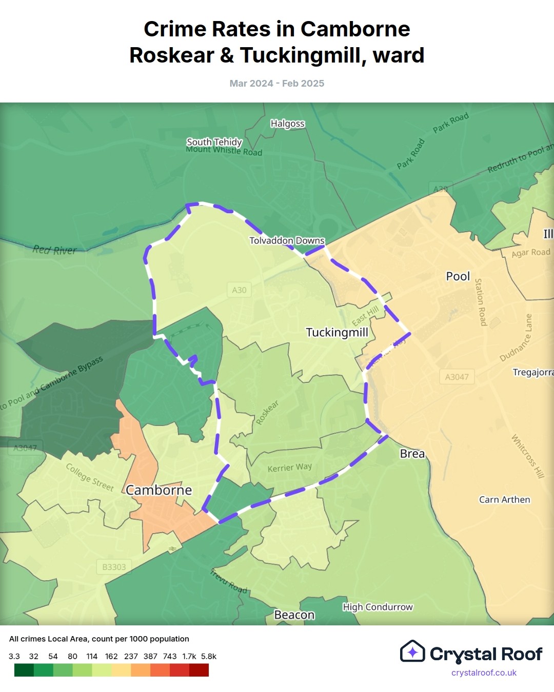 Camborne Roskear & Tuckingmill, (ward) includes areas with the following crime ratings (see map):