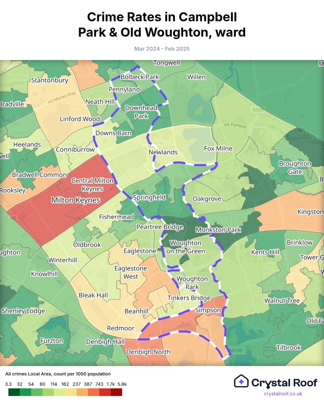 Campbell Park & Old Woughton, (ward) includes areas with the following crime ratings (see map):