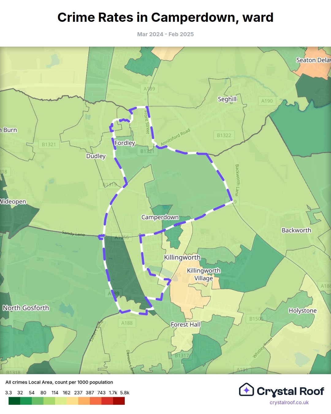 Camperdown (ward) is located within North Tyneside (borough). Annual total crime rate in North Tyneside (borough) is 105 crimes per thousand resident population, which can be rated as 5 out of 10 or medium crime level compared to other local authority districts in England and Wales.